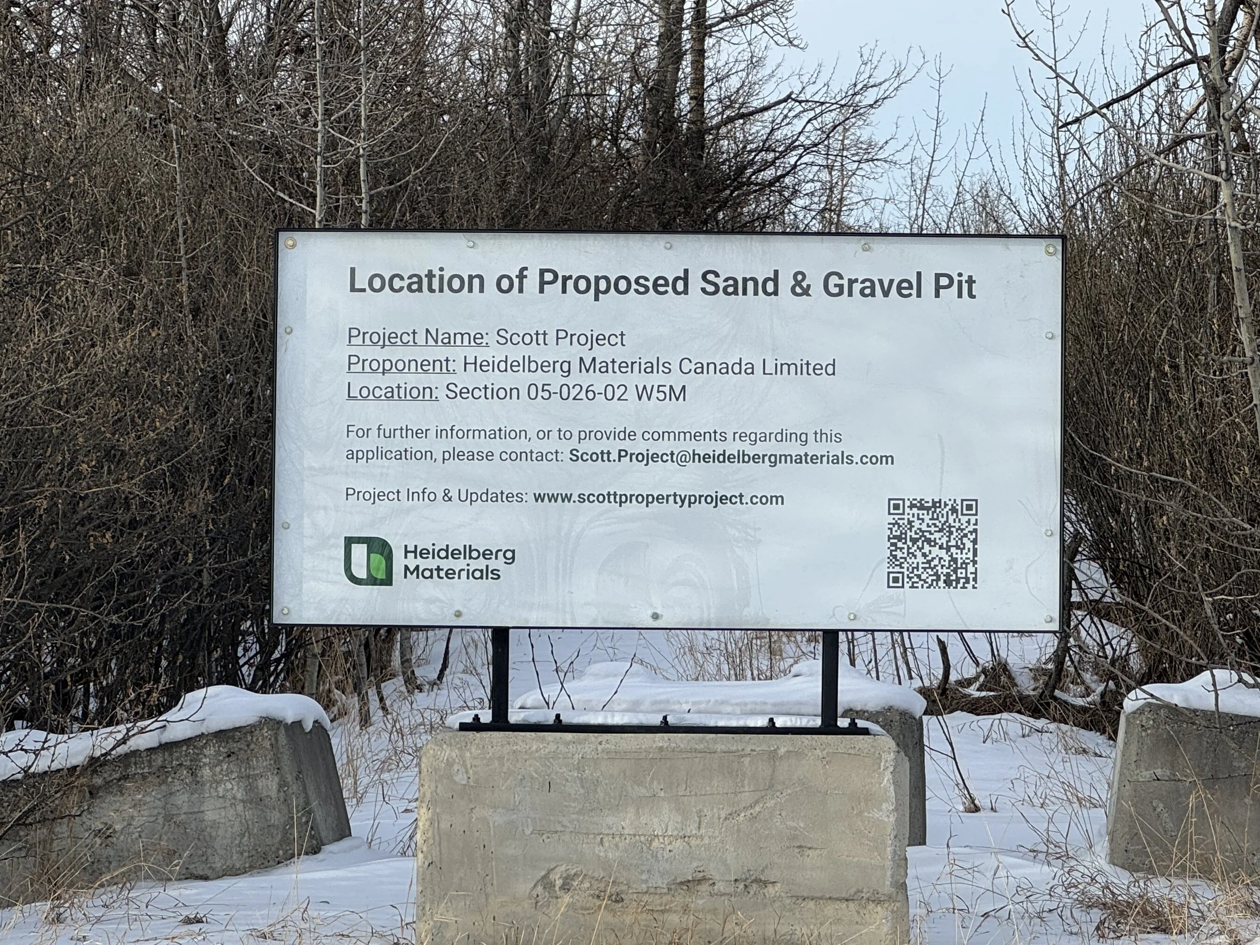 This sign is part of Heidelberg’s application to the Natural Resources Conservation Board (NRCB). It does not mean approval is imminent, but it confirms one thing: